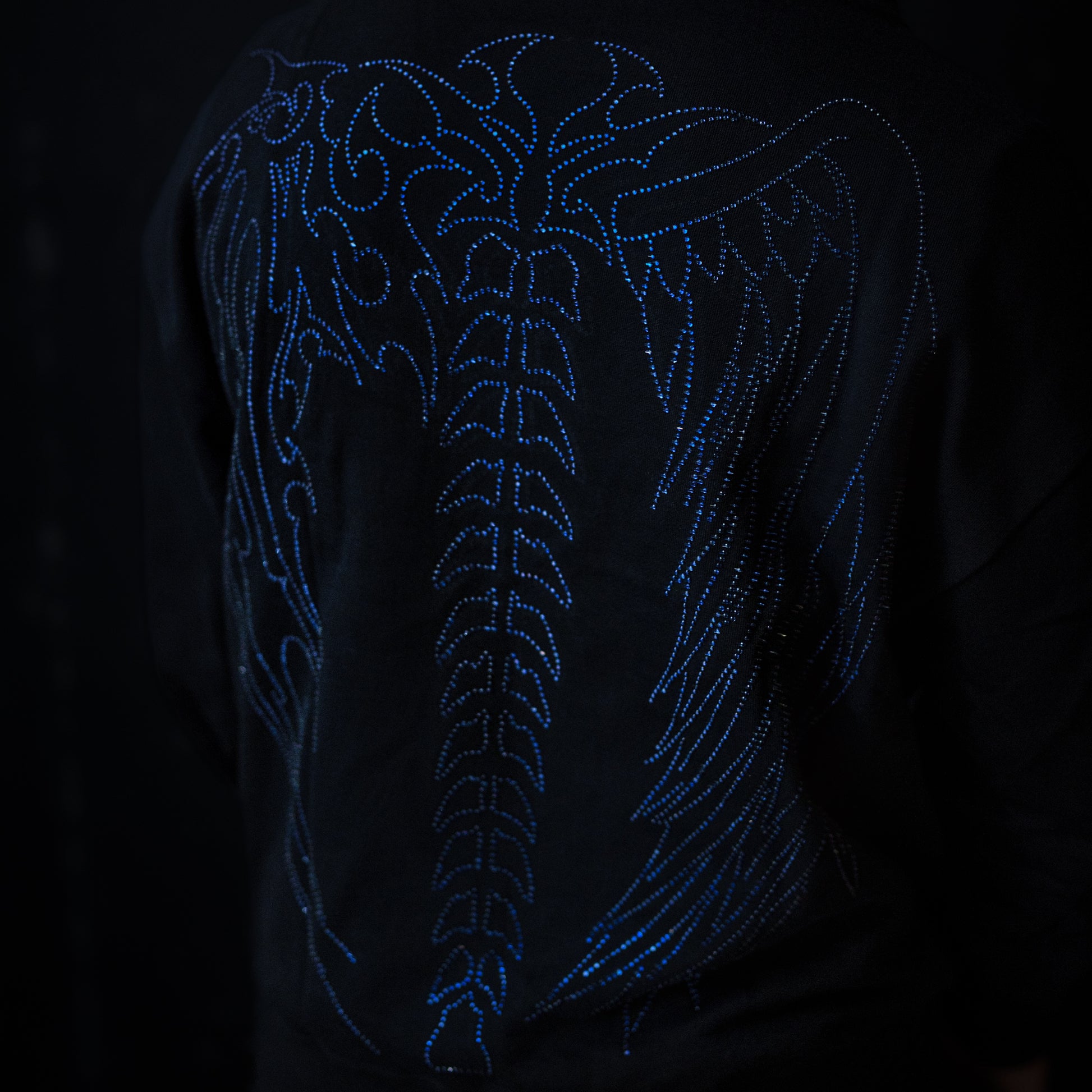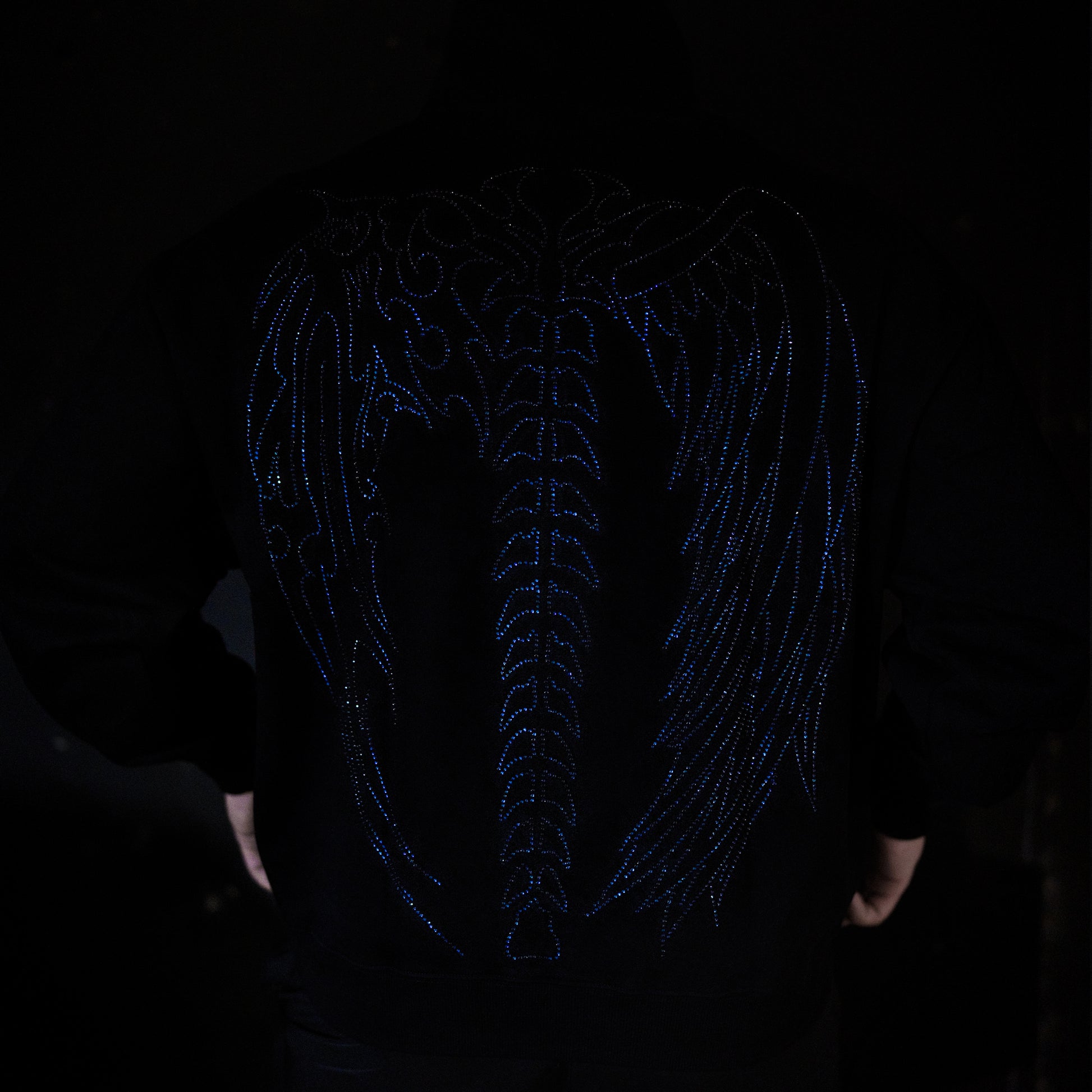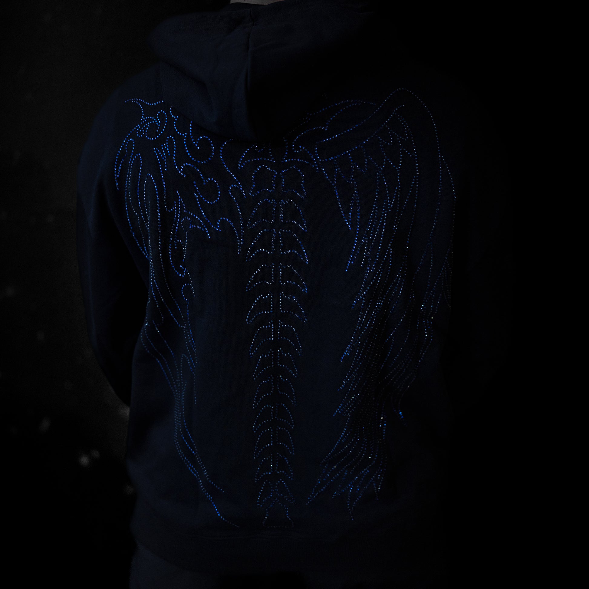 - Front And Back Blue to Black Rhinestone Design - 380GSM French Terry Cotton - Kangaroo Pocket - Oversize Fit Model is 6'0 wearing a size L